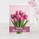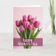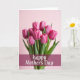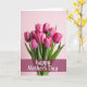 This greeting card features a bouquet of about nine fuchsia-pink flowers with closed and partly opened petals, standing close together like friends leaning in for a shared moment ❤️. Fine lighter streaks run up each petal, catching soft light that makes the blooms look fresh and gently luminous. Deep green stems and narrow leaves gather tightly and slip into a clear glass vase that peeks up from the bottom edge. The background is a smooth pastel pink wash, giving the scene a cozy, romantic calm without any distractions. Across the lower third, a wide deep-magenta band stretches horizontally, creating a strong base for the message. The greeting is placed centered on that band in white flowing lettering, crisp against the darker color 🌼. The flowers fill most of the upper area, with the tallest blooms reaching near the top while the glass vase remains only partly visible at the bottom.