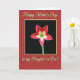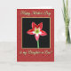 Designed with a rich floral theme, this greeting card centers on a single star-shaped flower set against a deep black panel, drawing the eye like a quiet gift of affection ❤️. The petals are deep red with thin white stripes that angle inward toward a bright yellow-green center, where fine stamens add a soft, intimate detail. Around that central panel, a warm ruby-red background shows a faint pattern of tiny star-like blossoms, creating a gentle, companionable backdrop. A slim yellow border frames the black center like a neat window, adding contrast without feeling harsh. Near the top, “Happy Mother’s Day” appears in flowing gold lettering, placed above the flower so it feels like a warm greeting being spoken. Near the bottom, “to my Daughter in Law!” sits in matching gold, balancing the layout and giving the message a tender, family-forward tone 🌼. The overall color pairing of red, gold, and yellow-green suggests closeness and appreciation through the way the elements lean toward the center. The black center panel is surrounded by a narrow yellow frame, and the outer red area is dotted with small, repeating floral shapes.