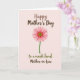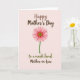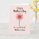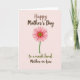 This card features a calm floral illustration centered on a smooth, pale blush background, creating a gentle, affectionate mood ❤️. In the middle sits a daisy-like flower with many soft pink petals that fan outward, as if opening toward someone it cares about. The petals show a light watercolor-style gradient that deepens near the base, giving them a tender, translucent look. A bright yellow-green center draws the eye, while a slim emerald-green stem drops straight down to anchor the bloom. Near the top, a flowing line of text in warm earthy brown is placed above the flower, following a soft curve across the upper space. Below the stem, a second line of text appears in olive green, smaller and quieter in style, like a gentle note meant for a cherished mother figure 👩. The flower’s pink petals surround a vivid chartreuse-yellow center against the pale blush field.