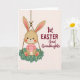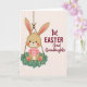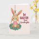 This card features a light brown, human-like bunny with soft pink-lined ears and rosy cheeks, wearing a pink-and-white striped top that adds a sweet, friendly tone 🐰. The bunny sits cozily in a round nest of deep green leaves dotted with small golden orbs that look like berries or tiny lights, giving the scene a gentle glow. Braided cords rise from the leafy seat and knot above, forming a swing that hangs slightly to the left side of the layout. Behind everything is a pale rose background with a faint grid pattern that adds a calm, orderly backdrop without stealing attention. On the right, deep crimson lettering reads “1st EASTER Great Granddaughter,” with “1st” and “EASTER” larger and “Great Granddaughter” set beneath in smaller, flowing letterforms. The spacing leaves the bunny and the words facing one another, like a quiet exchange between a tiny character and the message meant for someone loved 🌷. Soft shading on the cheeks, ears, and foliage gives the illustration a tender, affectionate look. The golden dots are scattered throughout the wreath-like greenery, with a few clustered near the lower edge of the swing seat.