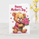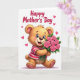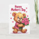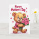 This design shows a cheerful, plush-like animal character centered on a bright white background, its tawny fur softly shaded to look touchable. It wears a horizontally striped top in deep red and creamy white, leaning slightly forward as if stepping closer to offer a gift. Big blue eyes with delicate lashes, rosy cheeks, and an open smile create the sweet look of someone sharing affection with a close friend or partner ❤️. Small magenta heart icons float around the figure, adding a gentle romantic mood without crowding the space. Cradled in its arms is a bouquet of seven fully opened pink roses with rich green leaves, the stems angled upward toward the character’s face as if it’s admiring them. A short message appears in flowing, cursive-style lettering, placed along the lower area of the card in a dark pink tone that matches the hearts 🌼. The petals are rounded and layered, with subtle highlights that make each rose look full and velvety.