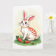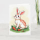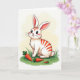 Designed with a sweet, long-eared bunny as the focus 🐰, this illustration shows a mostly white character accented by curved tangerine-orange stripes along its back and warm pink inside its tall ears. The bunny sits calmly on a rich green patch of grass, its relaxed posture and gentle gaze giving the scene a friendly, caring tone. In front of its paws, three orange root vegetables with leafy green tops rest in a loose cluster, varied in size like a small shared find. Soft, diffused lighting smooths the colors and gives the bunny’s fur a tender glow, as if it’s waiting patiently for a companion nearby 🐇. Behind it, a pale green, cloud-like wash suggests open air without any hard edges or distractions. The bunny’s face features large, glossy dark eyes with tiny highlights, faint rosy cheeks, and fine whiskers that angle outward in quiet curiosity. Near the top, a short Easter greeting appears in small, light-colored lettering, and the fluffy tail peeks out at the side of the seated figure.