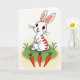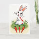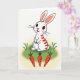 This design shows a long-eared white bunny standing upright, with deep red stripes across its body and inside its ears, looking forward with wide eyes and a small, rosy nose 🐰. Fine whiskers fan out from its cheeks, and the slight smile gives it the kind of gentle expression you might share with a close friend. It stands on a softly rolling patch of green grass, shaded to suggest a little depth and a cozy place to linger. The background stays mostly white, fading into a pale yellow glow near the ground like early spring light 🌷. Beneath the bunny, three orange root vegetables with leafy green tops sit in a neat row, as if set out as a sweet offering. Any greeting text would sit best above the character in a soft red, with a smaller line below in light gray to keep the focus on the face. The red accents in the ears and stripes echo the orange vegetables below, while the green grass anchors the scene. The three vegetables are evenly spaced in a straight horizontal line under the bunny’s feet.