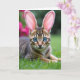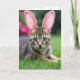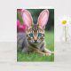 This design shows a small striped animal nestled in dewy green grass, set against a soft garden backdrop that feels like an inviting Easter morning 🌷. Its head and torso sit front and center, with oversized translucent pink ears rising high and catching gentle light along their fuzzy edges. Two bright aqua-blue eyes, rimmed with a darker outline, look forward with a tender, curious focus, as if it’s quietly keeping someone company 🐰. Warm brown and tan fur is patterned with dark tabby-like stripes and spots, fading into a paler underbelly near the grass line. Fine white whiskers spread from a petite muzzle, adding a soft, affectionate look to the face. In the upper area of the card, a short Easter greeting appears in small, light-colored lettering that stands out against the green background. The foreground grass is softly blurred around the lower body, while the background shows emerald foliage with scattered fuchsia blooms.