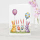 This card shows four friendly, human-like bunny figures lined up along the bottom, with two snowy white ones in the middle, a sunny yellow one, and a soft lavender one, all wearing rosy cheeks and simple smiles that feel like a shared inside joke 🐰. The two white bunnies lean slightly toward each other, their close spacing and gentle expressions suggesting affection and easy friendship. A thin strip of green grass runs beneath them, dotted with tiny wildflowers in mixed colors for a springtime touch 🌷. Above the group, two round hanging ornaments float in the open white space, one in purple with zigzag patterns and the other in light blue with scattered dots in warm tones. Each of the two center bunnies cradles an egg-shaped decoration, held carefully as if offering it to the other. One egg has red and gold stripes, while the other is blue with neat parallel bands that echo the colors overhead. The greeting text sits near the top in a soft pastel tone, centered against the white background, with the ornaments hovering a short distance below it. The grass band is lightly textured, and the tiny flowers appear as small specks of color along the base.