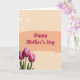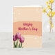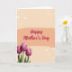 Designed with a tender Mother’s Day theme, this card centers on the words “Happy Mother’s Day” in warm fuchsia lettering that gently draws the eye ❤️. The text sits across the middle of a calm two-tone background, starting as a light peach-beige wash and rising into a deeper peach curve along the top edge. A soft glow spreads across the scene, with small, hazy light orbs drifting over the lighter area like quiet confetti. In the lower-left corner, three tulip-like flowers appear cropped as if part of a larger bouquet leaning in close, adding a sweet, caring feel to the layout 🌼. Their petals are deep fuchsia with crisp white edging, giving each bloom a delicate striped look that feels lovingly tended. Slender green stems and broad leaves angle upward, balancing the warm background tones and guiding attention back toward the central greeting. The upper area remains open and airy, while the bottom-left blooms anchor the composition with fuchsia-and-white petals against emerald greenery.