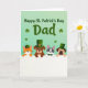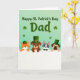 This card features a mint-to-spring-green gradient across the top, setting a fresh St. Patrick’s Day scene with scattered shamrocks ☘️. Centered in that green area, the message “Happy St. Patrick’s Day Dad” appears in dark green lettering, standing out clearly against the lighter background. Beneath it, a bright white horizontal band creates a neat stage where four animals lean in close as if posing together for a friendly photo 💚. An orange tabby cat peeks over the edge beside three dogs—a brown bulldog, a gray-and-white terrier mix, and a pug—each with wide eyes and small, gentle smiles that feel like a shared inside joke. Their faces sit close together, and the way they tilt toward one another adds a cozy, family-and-friends closeness to the lineup. Tiny green leprechaun hats top their heads, and one wears a green bow tie, tying the group neatly to the holiday theme. The cat’s striped fur and each dog’s distinct muzzle and markings are easy to spot against the crisp white band and the green backdrop.