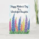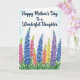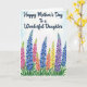 This greeting card features a softly textured background that fades from gentle white into pale blue, like a calm spring morning. Across the upper third, a dark blue message is written in flowing lettering and centered so it stands out clearly against the light sky-like wash. Below, the lower two-thirds fill with tall flowering spikes rising close together, creating the feeling of a shared garden moment, like friends strolling side by side ❤️. The blooms mix rich blues, bright pinks, sunny yellows, soft purples, and warm oranges, with petals layered in small clusters along each stem. At the base, thick green leaves spread outward in a dense band, grounding the scene and adding depth. Subtle brush marks show through the petals and foliage, giving the plants a tender, cared-for look 🌼. The lettering stays confined to the top area while the flowers climb upward beneath it, with the tallest stems reaching toward the words. Fine texture is visible in the background wash, and the flower stalks stand upright in neat vertical rows.