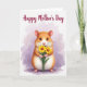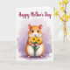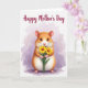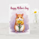 Designed with a sweet digital illustration, this card centers on a chubby, rodent-like creature with golden-brown fur that fades into a creamy white belly. Its small pink ears, tiny nose, and big dark eyes are drawn with a tender, affectionate look, as if it’s shyly offering a gift to someone close. In its little paws, it holds a bouquet of two yellow, daisy-like flowers with warm orange centers and slim green stems, adding a gentle romantic touch ❤️. The background is a soft wash of pastel lavender and light violet, like airy watercolor clouds that keep the scene calm and cozy. Near the top, a short Mother’s Day message appears in magenta lettering, spaced clearly above the character. Subtle lighting highlights the fur texture and the flower petals, drawing your eye toward the creature’s careful grip and sweet gaze 🌼. The two bright yellow blossoms sit front and center, angled slightly upward against the lavender sky-like backdrop.