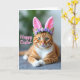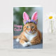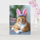 This card shows a relaxed ginger tabby with amber stripes and a white chest and paws, lying down with its front legs gently crossed as if posing for a sweet spring portrait. Soft pink bunny ears sit on its head, and a small crown of tiny lavender flowers adds a tender, friendly touch 🐰. The cat’s green eyes look straight ahead with a calm, affectionate focus, like it’s sharing a quiet moment with someone close. Light falls softly across the fur, bringing out the smooth texture and the fine white whiskers fanning from its muzzle. Behind the cat, the background fades into blurry washes of leafy green and muted gray, keeping the attention on the face and ears. A short Easter greeting appears over the image in rosy pink lettering, placed across the upper area without covering the eyes 🌷. The floral accents are clustered near the base of the ears, with lilac tones standing out against the warm orange coat.