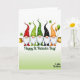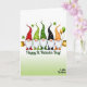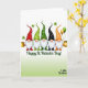 This greeting card shows five gnomes lined up across the middle on a white background that fades into a light green wash near the bottom, setting a cozy St. Patrick’s Day scene 💚. Each gnome wears a tall hat that curls at the tip, decorated with dots, tiny flowers, and stripes in reds, greens, black, orange, and yellow. Their long white beards spill down over their round bodies, and their rosy noses sit front and center, as if they’re leaning in close for a friendly group photo. The gnome on the far left holds up a shiny golden mug, while the one on the far right presents a small pot of gold with green-and-gold balloons floating beside it ☘️. Small shamrocks drift above their hats like confetti, adding motion to the quiet background. Centered beneath the gnomes, the text “Happy St. Patrick’s Day!” appears in green lettering, easy to spot against the pale backdrop. The hats’ patterns alternate from gnome to gnome, and the row feels connected, like close friends standing shoulder to shoulder. Above them, scattered green shamrocks hover, and the green gradient gathers softly along the lower edge under the message.