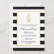 This stylish housewarming party invitation has a trendy black and white striped background, with a faux gold frame border and pineapple for a modern, tropical look!