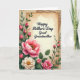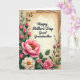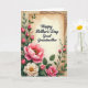 This design shows an aged, parchment-like card centered on a muted, earthy background, surrounded by an abundant border of green leaves that curl and overlap like a gentle embrace ❤️. The main message, “Happy Mother’s Day Great Grandmother,” sits in the middle in dark ink with a flowing, calligraphic look, standing out clearly against the warm paper tone. Around it, large flowers in blush pink and creamy white gather near the lower left and along the bottom, their softly ruffled petals and golden centers suggesting a tender, cared-for garden. Slender stems rise with small pink buds, adding the shy, budding feel of affection that grows over time 🌼. Behind the central card, faint antique music notation peeks out, like a quiet tune shared between loved ones. Soft, diffused light falls across the paper textures and velvety petals, giving the scene a calm, intimate glow. The greenery forms an organic frame that guides your eyes back to the words without feeling stiff or heavy. The pale musical notes are most visible along the upper edges behind the main card, partially obscured by overlapping leaves and stems.
