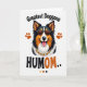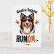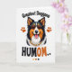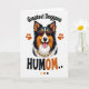 This card shows a tri-color dog’s head centered on a white background, with rich black fur, bright white markings, and warm auburn patches that feel like a cozy companion leaning in close. Dark sunglasses sit across its face, giving it a confident look, while the wide grin and pink tongue add a friendly, affectionate energy ❤️. Around the neck, a golden chain with small red touches suggests a fun, dressed-up moment, like it’s showing off for someone it adores. Small paw-print icons are scattered around the portrait, adding gentle movement and a sense of happy togetherness. The main message is split above and below the dog in large, rounded lettering, with “Greatest Doggone” placed near the top and “HUMOM..” set near the bottom in darker, high-contrast text. The fur is illustrated with layered strokes that make the coat look soft and freshly groomed, like it’s ready for a cuddle 🌼. In the lower area, a small row of color swatches echoes the black, white, auburn, and gold tones used throughout the design.