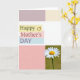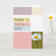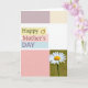 This card features a tall, vertical layout that blends simple graphic shapes with a gentle nature photo. The top area shows an abstract landscape made from muted lavender and soft cream rectangles, giving the scene a calm, roomy feel. Below that, a short greeting is set in separate words on pastel banner strips—light yellow, soft rose, and pale sky blue—stacked neatly down the center. A small gold loop-shaped emblem sits beside the first word, like a tiny ring that suggests a close bond and a tender promise ❤️. The lower half shifts into a close-up flower photograph, where a white bloom rises on a slim green stem, quietly echoing the soft colors above. The background fades into a smooth green blur, making the flower look like it’s leaning forward as if sharing a private moment 🌼. The white petals surround a golden-yellow center that stands out sharply against the out-of-focus greenery.
