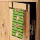 This kitchen towel features watercolor coffins and jack o' lanterns with ghosts coming out set on a fun green and dark gray striped background.