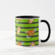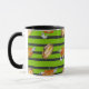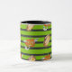 This mug features watercolor coffins and jack o' lanterns with ghosts coming out set on a fun green and dark gray striped background. Perfect for Spooky Season coffee or hot tea!