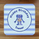 Striped Happy Birthday Blue Gold Robot with Name Square Sticker