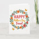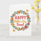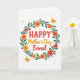 This card features a circular wreath of deep green leaves and flowers in coral, crimson, and sunny orange-yellow, set against a white background. At the center, the message reads “HAPPY Mother’s Day Friend,” arranged in three lines that feel close and friendly, like a hug between pals ❤️. “HAPPY” sits at the top in coral-red uppercase letters, drawing the eye first. “Mother’s Day” appears just below in golden-orange flowing lettering that softens the look, and “Friend” follows in warm red lettering that feels like a gentle sign-off. The wreath wraps around the words like an embrace, with blossoms that have small dark centers and petals that lean toward one another as if sharing a quiet moment 🌼. Two golden-orange butterflies hover near the upper edges of the wreath, adding a light sense of movement. Tiny pale yellow stars are sprinkled around the open white space, especially near the butterflies and along the outer curve of the wreath.