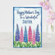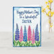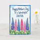 This greeting card features a soft watercolor scene that feels like a gentle spring day shared between close family ❤️. Near the top center, the message reads “Happy Mother’s Day To a Wonderful SISTER” in flowing deep blue lettering, with “Happy Mother’s Day” slightly larger and “To a Wonderful SISTER” tucked just beneath it. Behind the words, a pale blue sky wash is brushed with a few thin, white cloud streaks that add a calm, airy backdrop. Along the bottom, six tall flower spikes rise in a neat row, their bell-shaped blooms alternating between cool periwinkle and warm fuchsia pink, like two friends trading glances across the page. Slender green stems and small touches of leaf color keep the arrangement light and natural 🌼. The cool blues and warm pinks sit side by side in a way that suggests closeness and affection without needing extra decoration. A textured, deeper blue border frames the entire design, enclosing the sky and flowers with a slightly uneven painted edge. The border is thicker at the corners, with the brush marks and darker blue pooling visible around the frame.