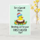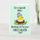This card features a sunny yellow baby bird popping out of a white eggshell, nestled in a rustic brown nest as if it’s being welcomed with gentle affection. The little character wears a small cone-shaped party hat with colorful stripes and tiny blue patterns, adding a sweet, friendly touch to the scene. Around the nest, leafy green plants curl outward like they’re leaning in close, creating a cozy frame that feels like a warm hug between friends. Pink, orange, and yellow flowers cluster at the base and sides, like a cheerful bouquet arranged for someone special 🌷. The background is a pale mint green wash that keeps everything soft and springlike, letting the yellow bird stand out clearly. A short greeting appears near the top in rounded, friendly lettering, set in a darker shade that contrasts gently against the mint backdrop. Additional small text sits lower on the design in a matching color, balanced so it doesn’t crowd the illustration. Tiny blossoms and fresh greenery ring the nest while the striped hat tilts slightly to one side 🐰.