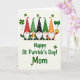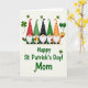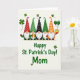 This card shows five festive gnomes lined up across the top, their tall cone hats patterned with dots and stripes in red, black, green, and orange, with white beards and small pink noses peeking out in a sweet, friendly way 💚. The scene feels cozy and close-knit, like they’re marching together with quiet affection, shoulder to shoulder under a gentle, warm light. On the left, one gnome holds a shiny golden mug, as if offering a cheerful toast to someone special. On the right, another gnome lifts a pot of gold, and two green balloons float up from it, adding a light, romantic lift to the lineup ☘️. Centered below the gnomes, the message “Happy St. Patrick’s Day! Mom,” appears in green lettering against a creamy background. The text sits in the lower half with plenty of open space around it, making it easy to read at a glance. Small shamrocks—some three-leaf and a few four-leaf—are scattered around the background like confetti. The hats show tiny dots and stripes, and the balloons rise above the pot of gold in two smooth green curves.