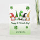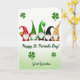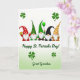 Designed with a softly fading green-to-white gradient background, a row of five gnomes marches across the center in a friendly St. Patrick’s Day scene 💚. Each gnome has a long white beard and small, simple features, letting their tall hats steal the attention with greens, reds, blacks, and touches of orange and gold. The leftmost gnome wears a red hat with white dots and lifts a golden mug as if clinking a toast with the group, while another holds a round green balloon that leans toward a neighbor like a gentle hello ☘️. Farther along, the gnomes stand close enough that their hats and beards almost overlap, giving the line a cozy, companionable feel. One near the end wears an orange-and-cream striped cap and cradles two tiny pots of gold that shine against the green tones. Four shamrocks sit like frame corners—two near the top edges and two lower down—balancing the layout with matching green accents. Centered beneath the gnomes, “Happy St. Patrick’s Day!” appears in dark lettering, with “Great Grandma,” set just below it in a smaller line. The hats show patterns like dots and stripes, and the shamrocks sit near the corners against the pale gradient backdrop.