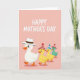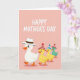 This card features a soft pastel pink background that gently lights up the scene and sets a tender, friendly mood ❤️. Near the top, white lettering sits in the upper area, leaving plenty of open space around it for an airy look. Marching across the main area is a line of four stylized bird characters, drawn with smooth outlines and simple shapes that feel welcoming. In front is a larger white bird with wide, expressive eyes and a faint rosy blush, giving it a caring, protective look as it leads the group. It wears a white fedora with a small brown band, and its orange beak and webbed feet add a bright touch against the pale backdrop. Behind it, three smaller birds follow on a diagonal path—two in sunny yellow and one in light teal—glancing forward as if sharing a sweet, together moment 🌼. Each of the smaller birds wears a striped cone party hat in red-and-white or blue-and-white, finished with a tiny pom-pom on top.