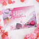Personalized Valentine's Day paper placemat design featuring pink, pink and white striped heart shaped balloons on a pink gradient background. The text is fully customizable. To change it use the Personalize option. For more changes, such as changes to the font, font color or text layout, use the Edit design tool option.