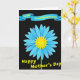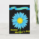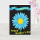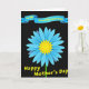 This design shows a large daisy-like flower centered on a deep black background, with layered sky-blue petals that lean toward one another like close friends sharing a quiet moment ❤️. The flower’s middle is a bright, sun-yellow shape with pointed rays, giving the scene a warm glow against the cool blues. A slim green stem drops straight down from the bloom, keeping the layout tidy and grounded. Near the top, a curved blue banner with darker shading stretches across, and a dedication appears on it in yellow lettering. Lower on the card, a second line of yellow text announces the occasion, positioned beneath the flower to balance the banner above. The strong contrast between blue, yellow, and black makes the words easy to spot at a glance, while the soft curves of the banner add a gentle, caring tone 🌼. The petals are arranged in neat layers around the bright yellow center, with crisp edges that stand out sharply from the black field.