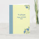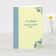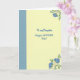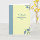This greeting card features a wide field of soft pastel yellow that fills most of the front, giving it a sunny, welcoming look. Along the left edge, a vertical strip of muted light blue adds gentle texture, like a lightly woven fabric. Centered on the yellow area, two lines of teal-blue text sit one above the other, with the first line in a flowing cursive style and the second line in a simple, easy-to-read print style. The cool teal lettering echoes the blue border, tying the layout together while keeping the message easy to spot. In the top right corner, a small cluster of blue blossoms leans inward as if nudging the words with a friendly, caring gesture ❤️. A matching floral cluster rests at the bottom right, with green leaves and tiny pale-blue accents that suggest a soft, affectionate closeness 🌼. The flowers are shaded in gentle blue tones, with layered petals and leafy stems curving toward the center on the right side.