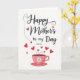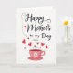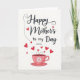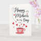 This card features a white background with a celebratory greeting in black lettering placed across the top, with small red hearts sprinkled around it ❤️. A thin dotted line curves downward from near the top, gently guiding your eye toward the main illustration below. Centered on the page is a soft pink teacup sitting on a matching saucer, angled slightly as if set out for a quiet, shared moment. On the side of the cup, a white daisy-like flower with a bright red center adds a sweet, friendly touch 🌼. From the cup’s rim, dotted lines rise like warm steam, ending in tiny hearts that suggest affection floating upward. Several larger red hearts cluster around the cup, creating the feeling of a caring embrace without crowding the space. The overall palette stays simple—soft pink, red, and black—against the white field, with the hearts and dotted “steam” clearly visible above the cup.