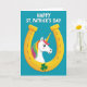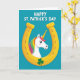 This design shows a golden horseshoe centered on a deep teal background, shining with soft highlights that give it a rounded, slightly 3D look. Nestled inside the curve, a white unicorn peeks forward with wide blue eyes and a faint rosy blush, as if leaning in close to share a sweet moment with the viewer. Its mane spills out in rainbow strands of pink, orange, yellow, and green, adding a cheerful 🌈 glow against the cool backdrop. A striped golden horn rises straight up, catching light along its ridges like a polished charm. At the base of the horseshoe, a three-leaf shamrock in rich green sits neatly, tying the fantasy scene to St. Patrick’s Day with a friendly ☘️ nod. The main greeting text appears above the horseshoe in bright white lettering, while a smaller line of text sits below in matching white to keep the layout balanced. The horseshoe’s lower curve frames the shamrock tightly, with the unicorn’s mane curling toward the edges in small, colorful arcs for extra motion and detail.