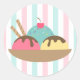 Add a sprinkle of sweetness to your party décor with this cheerful Striped Ice Cream Sundae Round Sticker. Featuring pastel stripes and a whimsical illustrated sundae topped with scoops of ice cream, chocolate drizzle, sprinkles, and a cherry, this sticker brings instant fun to any celebration. Perfect for sealing favor bags, decorating party cups, labeling treats, or adding a cute finishing touch to invitations and thank‑you notes. A delightful way to make your ice‑cream‑themed party even sweeter.