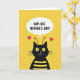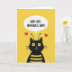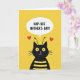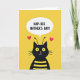 This card shows a charming black silhouette character that mixes a cat-like face with insect-like touches, set against a sunny yellow background that fills the whole front. The figure sits in the lower half, its round eyes outlined with yellow rings and dark pupils giving it a gentle, friendly look ❤️. A small pink nose, a slight smile, and thin dark whiskers add to the tender expression, as if it’s quietly admiring someone close by. Two thin antennae rise from the head, each ending in a tiny black dot, adding a cute, airy detail. Across the torso, alternating black and yellow horizontal stripes echo a bee-like pattern and bring a lively rhythm to the design. Near the top, a white speech bubble floats with a short message in a simple sans-serif style, set in dark lettering for easy contrast 🌼. Two small red hearts sit on either side of the speech bubble, evenly spaced against the yellow field.