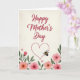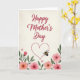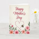 Designed with a vertical layout on a soft cream, lightly textured background, this card features the words “Happy Mother’s Day” across the upper half in warm crimson lettering. The text sits centered and slightly sweeping, with gentle curves that feel affectionate without being fussy ❤️. Beneath the message, a dotted heart outline is placed in the middle, like a quiet frame for caring attention. Near the heart, a small striped insect in yellow and black hovers with translucent wings, adding a sweet, friendly touch to the scene. Along the bottom edge, stylized flowers bloom from both corners in soft pink and peach tones, their petals looking lightly washed as if painted with water. Deep green leaves weave between the blossoms, creating a cozy garden border that feels like a tender gesture shared between loved ones 🌼. The dotted heart sits above the floral cluster, while the insect floats just to one side of it, wings angled upward.