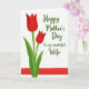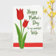 This greeting card features two tall, stylized flowers reaching upward on the left, their rounded petals filled with a deep red that feels like a quiet ❤️ between close hearts. Slender green stems rise from the bottom with wide green leaves that lean in slightly, as if keeping each other company. To the right, a flowing line of text stretches across the open white space in dark green, giving the layout an airy, affectionate balance. The lettering sits around mid-height, leaving generous breathing room above and below so the flowers and words can “look” toward each other. Near the bottom, a wide red stripe runs straight across the card, echoing the flower color and grounding the scene like a steady promise. Thin white dashed marks travel along the stripe in neat rows, adding a gentle, thoughtful detail like careful stitching 🌼. The background stays bright white, making the reds and greens stand out sharply without crowding the design. The lower band’s red is matched to the petals, and the tiny white dashes are evenly spaced from left edge to right edge.