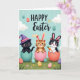 This card features three cute, stylized kitten characters peeking out of cracked eggs beneath a light blue sky, with a gentle, friendly closeness in their wide-eyed expressions 🐰. On the left, a sleek dark kitten rises from a teal egg and wears a tall purple cone-shaped hat with coral edging and a small red bow. In the middle, an orange striped kitten emerges from a pink egg, sporting long beige-and-pink bunny ears that tilt upward as if listening. On the right, a black-and-white kitten pops from a coral egg, holding an orange carrot close like a small gift 🐇. Soft light washes over fluffy white clouds while decorated eggs float above and sit around the scene, adding little touches of celebration. Along the grassy foreground, tiny wildflowers and scattered patterned eggs create a spring meadow setting. Across the top, “HAPPY Easter” appears in large decorative lettering, with “HAPPY” set above “Easter” in a darker contrasting color. The eggshells show jagged edges, and the grass is dotted with small blossoms in pink, yellow, and white.