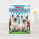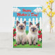 Designed with two small feline cubs posed side by side in the foreground, this card shows them leaning close with tender, steady blue-eyed gazes that feel affectionate ❤️. Their cream fur shifts into mocha shading on the ears, muzzles, and paws, giving them a soft, cozy look against the garden scene. They sit in thick green grass bordered by clusters of red and white roses, whose open petals frame the pair like a romantic corner of a yard. Behind them, a white picket fence runs across the scene, separating the flowers from a wide blue sky above. Rounded white clouds float overhead, adding gentle shapes that keep the background light and airy 🌼. Across the upper third of the design, a large flowing message appears in bright red lettering, centered so it stands out against the sky. Near one cub, a small folded red paper note rests on the grass, angled slightly as if just placed there. Share your Mother’s Day sentiments with someone you love.
