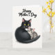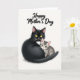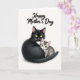 This card features a tender scene of a sleek black adult cat with golden-yellow eyes holding a small gray, stripe-patterned kitten close, their faces angled toward each other as if sharing a quiet moment ❤️. The adult cat’s calm, watchful gaze and slightly curved posture suggest gentle protection, while the kitten relaxes into the embrace with soft green eyes and a peaceful expression. A small white patch on the adult cat’s chest contrasts with the dark coat, and the kitten’s light stripes add softness and detail. The background is plain and light, leaving plenty of open space so the pair feels like the clear focus in a cozy, intimate setting. Fine fur textures are visible, with the adult’s coat appearing dense and smooth and the kitten’s fur looking fluffier and delicate 🌼. Near the top, the words “Happy Mother’s Day” are centered in a flowing, dark-colored line of text that stands out against the pale background. The lettering sits above the cats without overlapping them, leaving the embrace unobstructed and easy to see. The adult cat’s golden eyes and the kitten’s green eyes provide small, bright points of color against the simple backdrop.