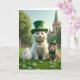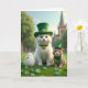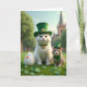 This card shows a tall white cat with golden eyes wearing an emerald top hat with a gold medallion and a matching collar, standing close to a smaller striped kitten in a tiny green hat and green bandana, their bodies angled together like close friends. Around them, soft spring light falls over rich green grass dotted with little shamrocks ☘️, giving the scene a fresh, lucky-day look. The kitten’s wide gaze lifts toward the bigger cat, and the larger cat’s calm posture makes the pair look quietly devoted, as if posing for a sweet photo. To the left stands a small egg-shaped character with dot eyes and a carrot nose, adding a funny side note to the cozy moment. Behind the trio, blurred trees and a distant spire suggest a peaceful park under a clear sky. St. Patrick’s Day text sits near the top in green lettering, with a smaller line beneath it in gold for contrast 💚. The hats, collars, and shamrocks repeat shades of green against the pale fur and striped coat, and the carrot-nosed figure remains on the left edge of the grassy foreground.