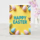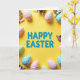 This card features an overhead scene with a buttercup-yellow background and the words “HAPPY EASTER” centered in large azure letters. Around the message, small striped cats peek in from the corners and edges, their paws resting on the border as if they’re leaning closer together like friendly companions. Smooth egg shapes fill the surrounding space in soft pastel pink, light blue, and pale green, creating a gentle spring frame 🌷. Many of the eggs include delicate white snowflake-like patterns, adding an unexpected wintry touch beside the Easter theme. The lighting is even and soft, showing the rounded shine of the eggs and the fine texture of the cats’ fur without harsh shadows. The cats’ curious, side-glancing eyes and close spacing suggest a cozy, affectionate moment, like they’re sharing the scene with each other 🐰. White snowflake motifs sit neatly on several pastel eggs near the outer border, with a few cat paws tucked just inside the frame.