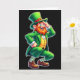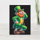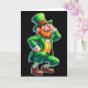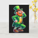 This card shows a classic leprechaun striking a cheeky squat against a deep black background, lifting his right hand to shade his bright blue eyes as if searching the distance ☘️. His fiery orange beard and matching brows frame a wide, open smile that feels like he’s sharing a private joke with whoever’s looking. He wears an emerald green jacket and trousers with a tall green top hat, finished with a red band and a gold shamrock buckle. A sunny yellow waistcoat with shiny gold buttons adds a friendly glow, and green-and-white striped socks peek out above brown shoes with buckles. A crisp white outline traces the whole figure, making him stand out sharply from the dark setting. The shading is dramatic, with strong highlights and deep contours that give his face and clothing a rounded, almost touchable look 💚. There’s no scenery behind him—just that black field—so the bright greens, yellows, and oranges stay front and center, with his hat tilted slightly as his hand hovers above his eyes.