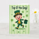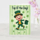 This card features a cheerful cartoon leprechaun stepping forward as if he’s hurrying over to greet a friend, his wide grin and rosy cheeks giving him an easy, welcoming charm 💚. He wears a deep emerald suit with a sunny yellow waistcoat and dark buttons, finished with a neat red bow tie that adds a little flirt of color. In one hand he holds a green top hat with a gold buckle, tipped as though he’s saying hello to someone special just off to the side. Behind him, the setting is a soft light-green field with faint vertical stripes that add gentle depth without stealing the focus. Small four-leaf shamrocks are scattered around, each with a light glow that makes the scene feel lucky and bright ☘️. Across the upper area, the phrase “Top O’ the Day!” sits prominently in thick lettering, with white edging that helps it stand out against the green. The palette stays mostly green, with yellow and red accents drawing your eye between his outfit, his face, and the raised hat. Several glowing shamrocks float around the leprechaun against the pale striped background, with the title text anchored near the top.