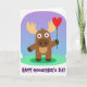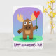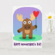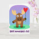 This design shows a cute, deer-like character standing in the center in warm brown tones, with branching antlers and wide, gentle eyes that give it a friendly, affectionate look ❤️. One arm lifts up to hold a thin green string, and a bright red, heart-shaped balloon floats close to its head like it’s being offered to someone just out of view. The character stands on a softly curved green patch of ground, adding a calm, outdoorsy setting that feels relaxed and welcoming. Behind it, the sky shifts from light lavender near the top to soft blue lower down, creating a dreamy backdrop without distracting from the tender gesture. A soft white border curves around the upper area, framing the scene like a cozy window. Near the bottom, a casual violet message sits below the illustration, centered and easy to spot, with small, friendly lettering 🌼. The red heart balloon sits to the upper right of the character’s face, contrasting sharply against the cool-toned sky.