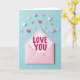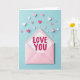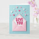 This design shows an open pastel pink envelope resting near the lower middle of a cool blue background, with a white card peeking out as if just pulled free. The card has faint diagonal stripes, and the words “LOVE YOU” sit centered in bright fuchsia lettering, drawing your eyes right away ❤️. Around the envelope, paper hearts in bright pink, light pink, and white scatter outward and upward, like little notes drifting into the air between two people who can’t stop thinking about each other 🥰. The hearts vary in size, with smaller ones closer to the envelope opening and larger ones spaced farther out, creating a gentle sense of motion across the scene. Soft, diffused light adds mild shadows under the envelope, card, and hearts, giving the paper edges a slightly raised look. The warm pinks against the cool blue background make the message feel tender without being loud, as if it’s meant for a quiet moment shared together. The fuchsia “LOVE YOU” stands out sharply against the striped white card, while the surrounding hearts form a loose trail that arcs across the top half of the frame.