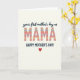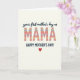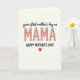 The front design shows a tender congratulatory message arranged in three lines on a subtly textured off-white background. At the top, a flowing deep indigo line of text sits centered, setting a gentle, affectionate tone like a quiet note shared between close friends. In the middle, the word “MAMA” is the focal point in large uppercase letters filled with horizontal stripes in blush pink, sky blue, and soft goldenrod, giving the letters a cozy, woven look. The color pairing feels romantic and supportive, like a warm embrace held a moment longer ❤️. Beneath “MAMA,” a final centered line appears in the same deep indigo, with simpler lettering that grounds the layout. The spacing between lines is airy and balanced, keeping the message easy to read while still feeling intimate. A single small crimson heart sits centered below the text, standing out sharply against the pale background 🌼.