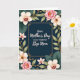 This greeting card features a deep midnight-blue rectangular panel at the center, edged with a thin gold line and small ornate gold corner details that feel like a gentle embrace. Inside the panel, a short message sits centered in light-colored lettering that stands out clearly against the dark background ❤️. Around this focal area, a rich ring of flowers and leaves frames the card like close friends leaning in for a photo. Cream-white blossoms show deep crimson and sunny yellow centers, while soft blush-pink roses open wide with golden stamens, giving the arrangement a romantic, cared-for look. Broad teal-green leaves with faint veins mix with slimmer olive leaves and warm golden-brown stems, adding depth and movement. The lighting looks soft and diffused, making the petals appear slightly luminous, like a tender moment held in stillness 🌼. The contrast between the velvety blue center and the pastel blooms creates a layered, gallery-like finish. Tiny gold flourishes sit neatly at each corner of the central panel, surrounded by overlapping petals and leaves.