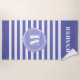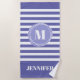 Trendy cabana stripe beach towel in blue violet shade) and white striped pattern with your monogram inside an abstract periwinkle circle and name.