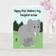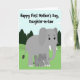 This card shows two stylized grey elephants in a gentle, family-like pose, with the larger one angled protectively as the smaller one leans in close near its legs ❤️. The adult elephant has bright white tusks and wide, expressive eyes that seem to glance down with a tender, caring look. The smaller elephant mirrors the simple shapes and smooth finish, adding to the soft, friendly feel of the scene. Across the top, the message “Happy First Mother’s Day, Daughter-in-Law” appears in rounded, thick lettering that stands out clearly against the sky. The text sits centered above the elephants and is rendered in a dark tone that reads easily at a glance. Behind them, rolling green hills stretch across the background with a few dark green, cone-shaped trees spaced out like a distant grove 🌼. The sky is pastel blue with a handful of small, puffy cloud shapes floating overhead.